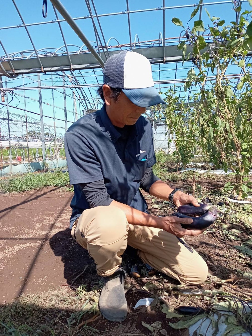 「今回の大型台風に備え、多くのハウスのビニール屋根をはがしました。なすはデリケートな野菜で枝や葉の擦れは極力避けたいのですが、ハウスごと飛ばされたり倒壊する被害を避けるためやむを得ない決断でした。今は水浸しになった圃場の片づけや廃棄作業を行っています。本来の品質のなすを出荷出来るまでにはまだ時間がかかりますが、こだわって栽培してきたなすを少しでもお客様にお届け出来ればうれしいです。」