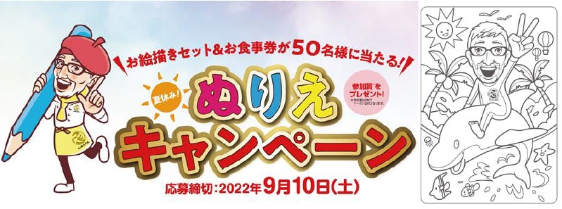 揚げたてから揚げとテリー伊藤こだわりの玉子焼き「から揚げの天才」は、2022年7月22日(金)~2022年9月10日(土)まで小学生以下限定の「夏休みぬりえキャンペーン」を実施しています。「から揚げの天才」の店頭に置いてある専用用紙に色を塗ってご応募できます。応募方法は、「#から揚げの天才ぬりえ」「#から揚げの天才」をつけて公式Twitter、Instagramにぬりえを投稿することで参加できます。選出された50名様にはお絵かきセット&お食事券2,000円分(500円×4枚)をプレゼントします。※参加賞もご用意しております。キャンペーンの詳しい内容は、「から揚げの天才」公式ホームページ、公式アプリからご確認頂けます。ぜひ、皆様のご応募お待ちしております。