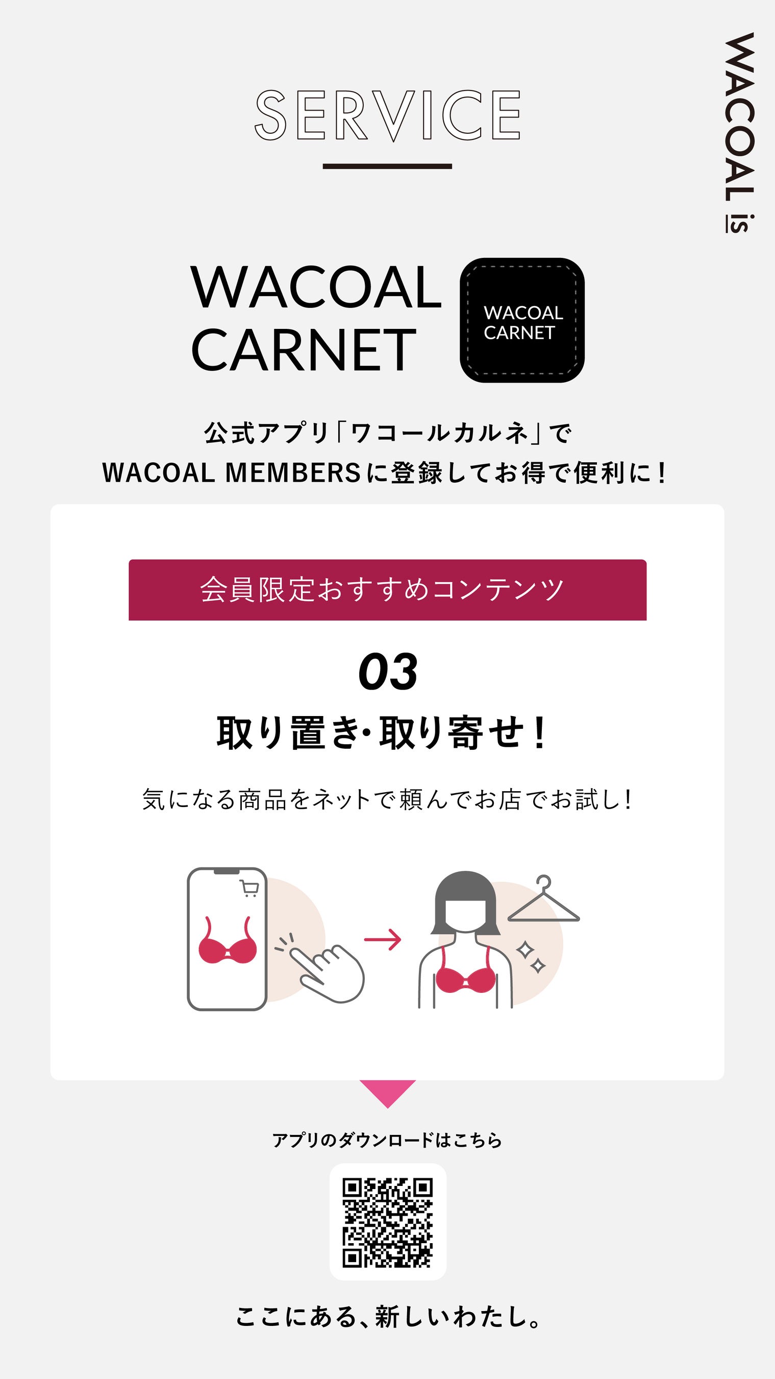 「WACOAL is」は“ここにある、新しいわたし”をコンセプトに、従来の“下着を購入する”目的だけでなく、知らなかった自分を発見・体験できるショップです。店内では「ワコールウェブストア」と連動した編集コーナーを展開し、人気ランキングや特集コンテンツなどデジタル上での企画を実際に商品を見ながらリアルに体験することができます。また気になった商品があれば店頭の二次元コードからすぐに「ワコールウェブストア」で詳細情報を見ることができ、オンライン上で在庫を確保し、ご希望の店舗で商品をご確認いただける取り置き・取り寄せサービスにも対応。さらに3D計測サービス「SCANBE(スキャンビー)」を導入し、3D計測や[わたしに合うブラ診断][わたしを知る骨格診断]のサービスを通して自分のからだを知る体験も可能です。
