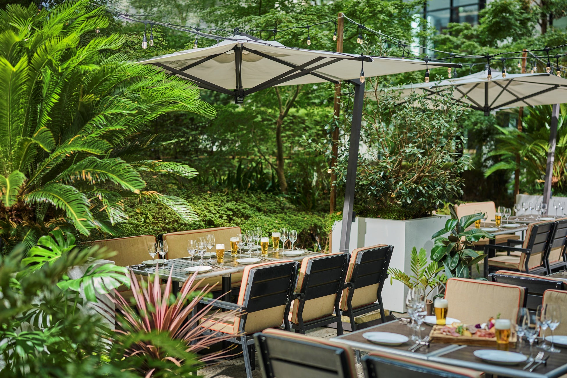 ダイニング席はカリフォルニアの別荘をイメージした暖炉を囲むアットホームかつ上質な空間、緑に囲まれたテラス席は品川という都心にありながらも自然が感じられる特別な空間で、日々のせわしなさを忘れさせる時間をお過ごしいただけます。