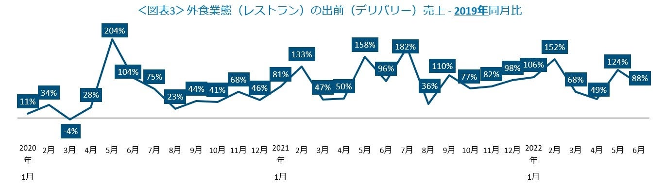 その後も外食業態計(レストラン計)の出前(デリバリー)売上2019年同月比をみると、プラス成長が続いています。デリバリー増加のピークは2020年5月の204%増ですが、2022年6月はを見ると同88%増とプラス成長だったものの、前月同様に、2020年、2021年の同月と比べて下回っており、これまでの爆発的な成長から、成長が穏やかになっていることがわかります。これは決して市場の鈍化を表しているわけではなく、爆発的な成長を続けてきたデリバリーは、その間に市場再編もすすみ、今後は穏やかな成長、定着へ移行すると考えられております。
