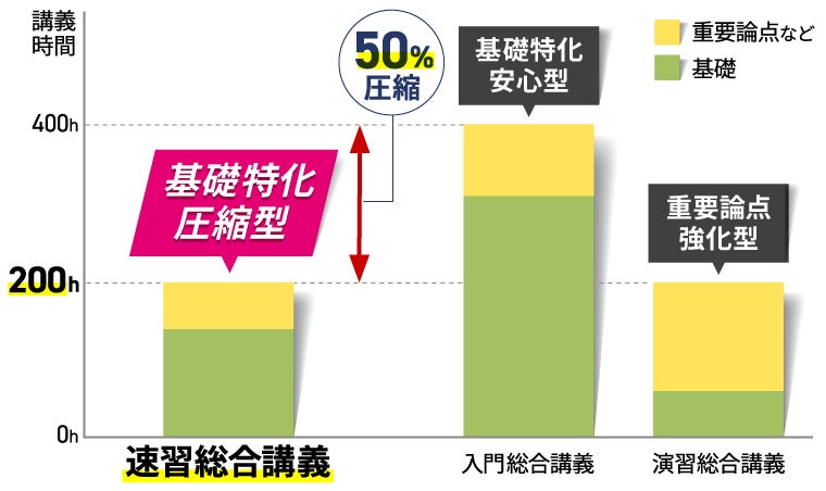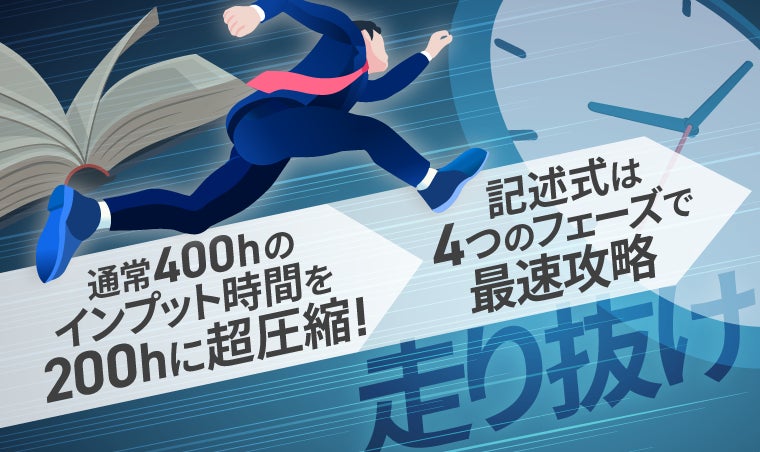 試験範囲を1周するための「速習総合講義」はベテラン講師の経験や出題分析をもとに、重要論点や出題可能性の高い部分をピックアップし、コンパクトに200時間にまとめました。通常のカリキュラムの1/2のボリューム、かつ猛スピードで1周します。