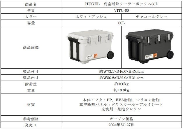 最大22.8日間(※1)の高い保冷力を実現した「HUGEL 真空断熱クーラーボックス60L」発売