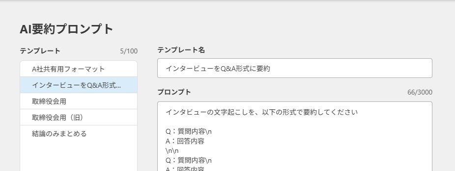 プロンプトは、ユーザーごとに100件までテンプレートとして保存できます。要約実行時にテンプレートを選択・呼び出しできるため、毎回プロンプトを入力する手間を解消します。呼び出し後の編集も可能なため、用途に合わせて微調整することができます。