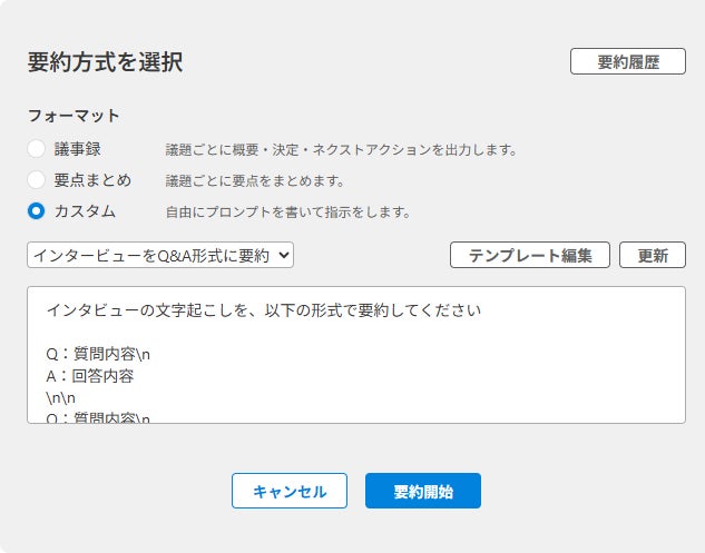 ・文字起こしをカスタムプロンプトで要約できるようになりました。