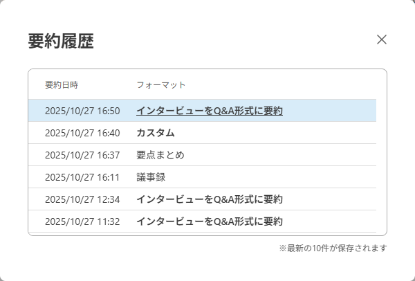 従来は管理者のみしか確認できなかった要約履歴を、議事録ごとの作成者も確認できるようになりました。「カスタム」形式の場合はプロンプトも確認できます。