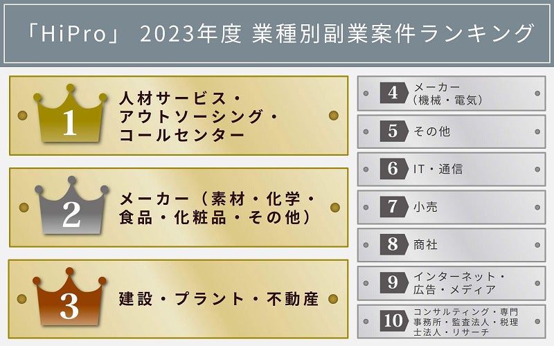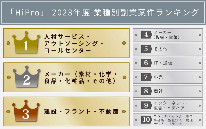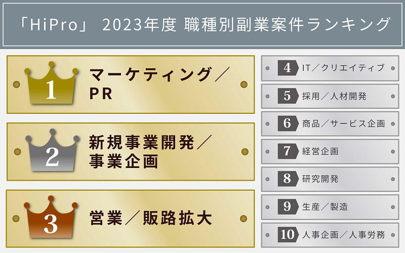 また、これまで副業人材の活用に積極的ではなかった「生産/製造」が9位にランクインしたことは、2023年度の特徴の一つといえるでしょう。売上拡大に向け、新製品の開発や商品の販路拡大に取り組むべく、市場のニーズを把握するために副業人材の知見を活用し始めた製造業が増えたことが背景であると考えます。(HiPro編集長 鏑木 陽二朗)
