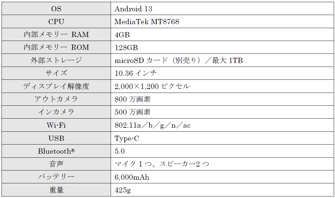 高性能でパワフルなオクタコアCPUであるMediaTek MT8768を搭載。HDコンテンツもスムーズに再生できます。Android 13に対応しているのでさまざまなアプリを楽しめ、定期的なセキュリティーアップデートとともに最新の機能が提供されます。6,000mAhの大容量バッテリーを搭載しているため、最大9時間のストリーミング動画再生が可能です。
