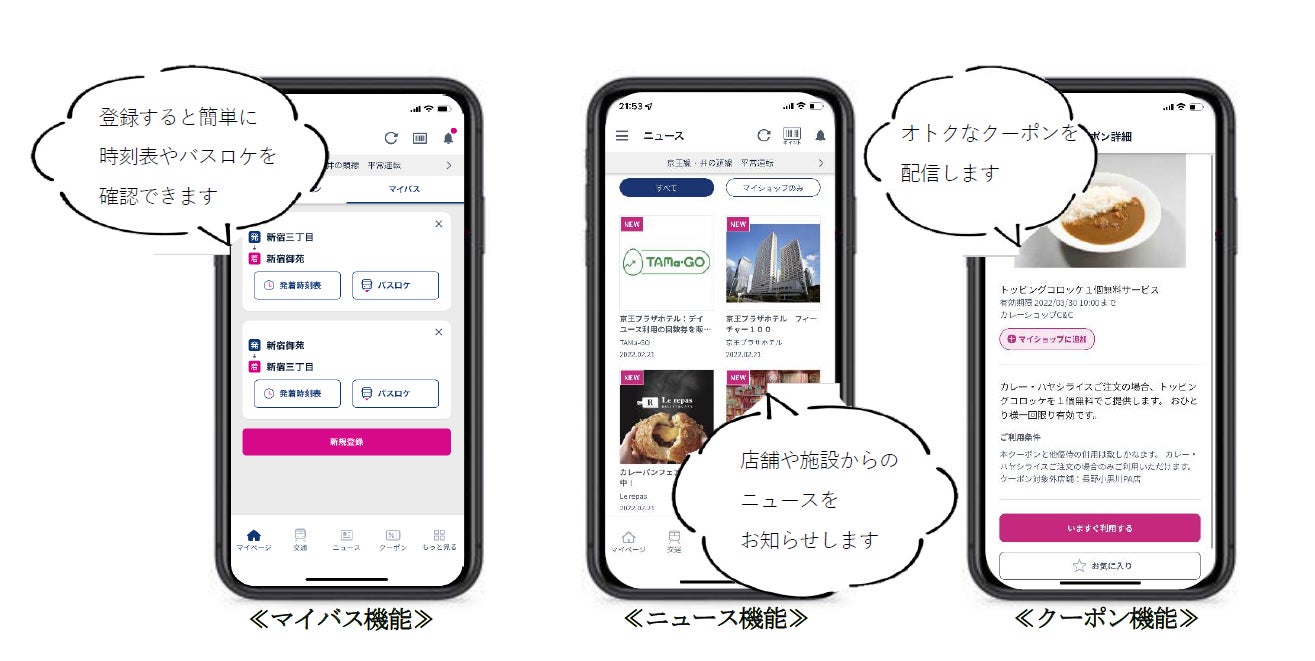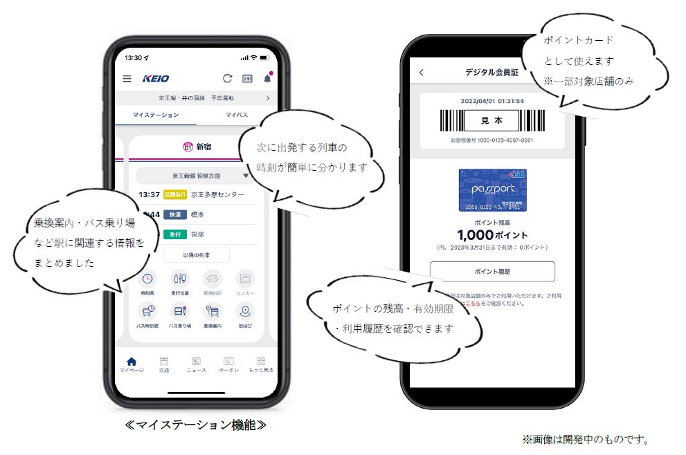 『マイステーション』には「乗換案内」「バス乗り場案内」「時刻表」などを追加するほか、新たに追加した『マイバス』ではよく使うバス区間の設定が追加できるようになり、「発着時刻表」「バスロケ」をアプリ内で確認できるようになります。また、4月1日(金)からは『デジタル会員証』を追加し、京王グループ共通ポイントサービスの一部対象店にて京王ポイントを「貯める・使う」ことができるようになります。