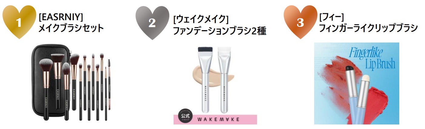 今回のランキングでは、1位に[EASRNIY]のメイクブラシセットがランクイン。柔らかく粉含みがよいブラシです。2位は[ウェイクメイク]のファンデーションブラシ2種。平たい短毛のブラシでファンデーションがムラなく広がります。3位は[フィー]よりフィンガーライクリップブラシがランクイン。指先のように柔らかなシリコンタイプと繊細な毛タイプのリップブラシ2種類からお選びいただけます。他にも上位には、用途に合わせて活躍する個性的なブラシがランクインしました。