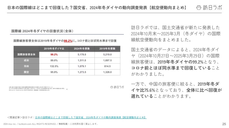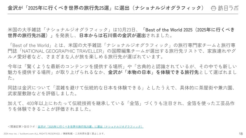 ほかにも「金沢が2025年に行くべき世界の旅行先25選に選出」「新千歳空港の2024年冬ダイヤ、コロナ前水準を上回るまで回復」など インバウンド担当者必見の情報を1本のレポートに凝縮!