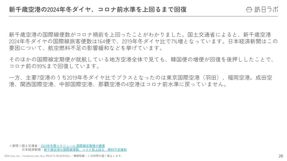 新千歳空港の2024年冬ダイヤ、コロナ前水準を上回るまで回復