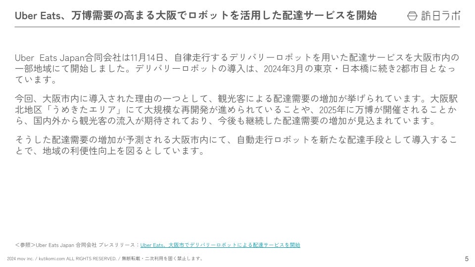 UberEats ロボット配達開始、万博需要見すえ大阪で:観光・インバウンドの最新動向がわかる!インバウンド情報まとめ「2024年11月前編」を訪日ラボが公開