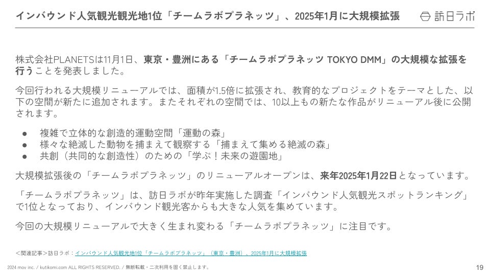 業界最大級のインバウンドビジネスメディア「訪日ラボ」及び 店舗向け集客一元化プラットフォーム「口コミコム」を運営する株式会社mov(代表取締役:渡邊 誠、本社:東京都渋谷区、以下mov)は、「インバウンドに関する最新トレンド・データ」「政府・自治体・企業などのインバウンド関連の取り組み」をはじめ、インバウンド対策に役立つニュースをまとめた「インバウンド情報まとめ【2024年11月前編】」を公開しました。