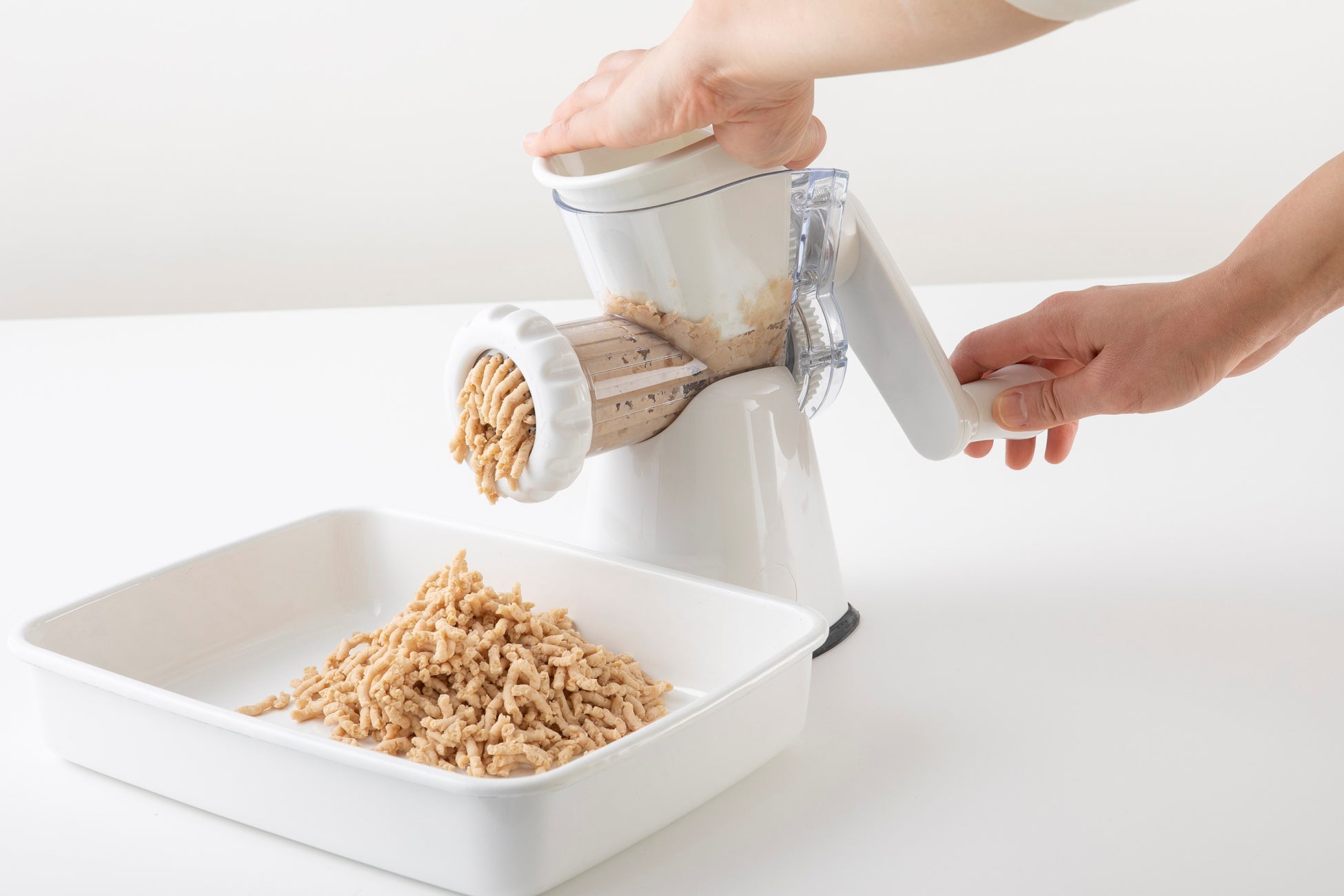 味噌作りの中でも大変な工程と言われる煮た大豆をすり潰す工程が、ヘルシーミンサーを使えば簡単かつきれいに仕上げることができます。目の部分は簡単に交換できる細目と粗目の2枚のアタッチメントがついているため、お好みの粗さでミンチ可能。