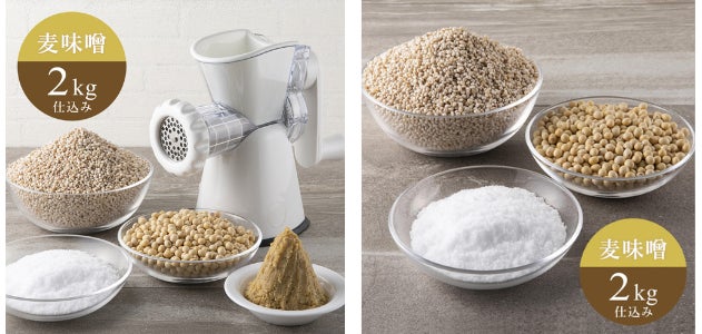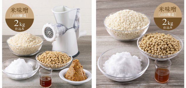 ミンサー付米味噌セットと、原材料のみ米味噌セット2kg仕込みの2種類をご用意しております。