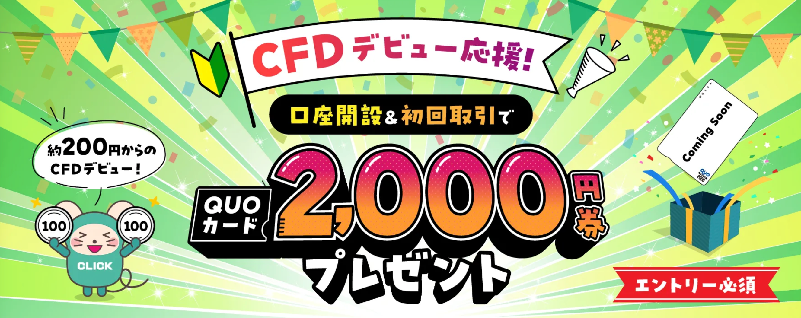 現在当社では、キャンペーン期間内に条件をすべて達成された先着2,000名のお客様を対象に、オリジナルQUOカード1枚(2,000円券)をプレゼントする「【CFDデビュー応援】QUOカード2,000円券プレゼントキャンペーン!」を開催中です。この機会にぜひ、CFD取引をご検討ください。