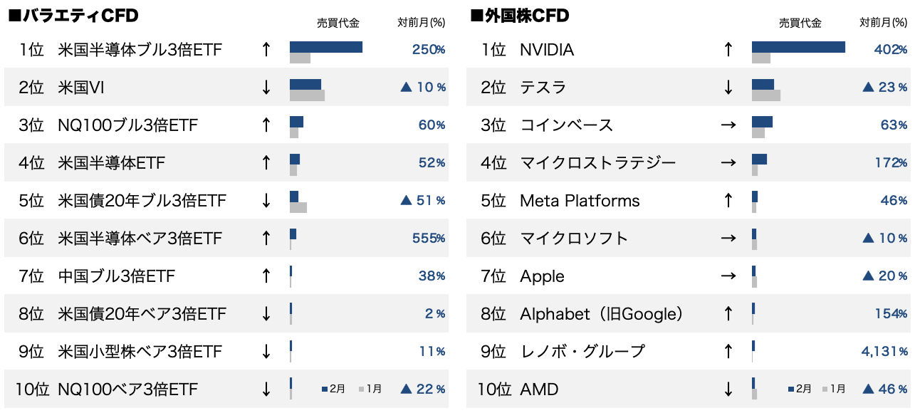 ~総合首位は日本225!バラエティCFDは米国半導体ブル3倍ETF、外国株CFDはNVIDIAが首位に~