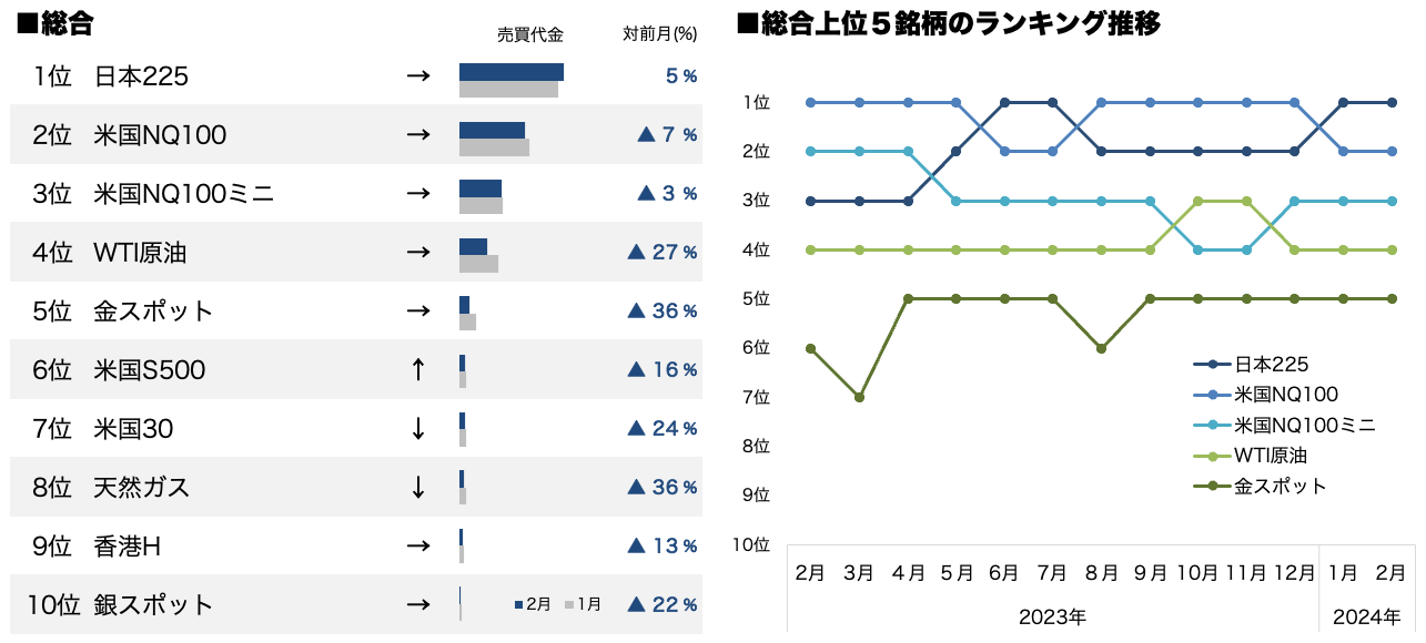 2024年2月は、1月に続き日経平均株価がバブル経済崩壊後の高値を更新し大きく上昇したことから、総合ランキングトップ10の銘柄の中で唯一売買代金を伸ばした「日本225」が首位となりました。