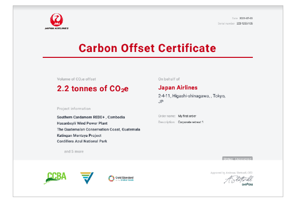 (*2) 2022年2月1日付プレスリリース 第21109号 『航空機ご利用時のCO2をオフセットするプログラム「JALカーボンオフセット」をリニューアルします』: https://press.jal.co.jp/ja/release/202202/006498.html