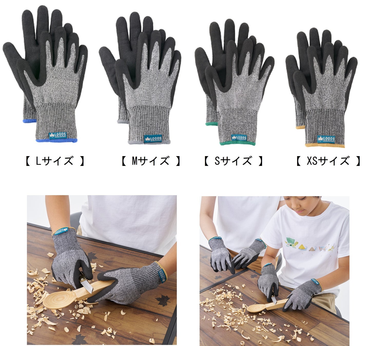 また、グローブ中指先端から下端までの長さが約22㎝のLサイズから約17㎝のXSサイズまで4種類のサイズをラインアップしています。小さな子どもから大人まで着用できる幅広いサイズ展開のため、親子やパートナーでお揃いで着用することができます。高い安全性と細かな作業も快適にこなせるので、キャンプやブッシュクラフトなどのアウトドアから園芸、DIY、などさまざまなシーンで活躍します。