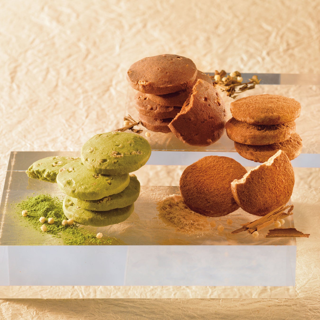 さくさくと歯ざわりのよいぶぶあられと、細かく砕いたローストアーモンドを生地に混ぜて焼き上げた、ほろっと口の中で溶けていくひと口サイズの焼きショコラ。[宇治抹茶]、[ほうじ茶]、[きなこ&シナモン]の3種類を詰め合わせました。