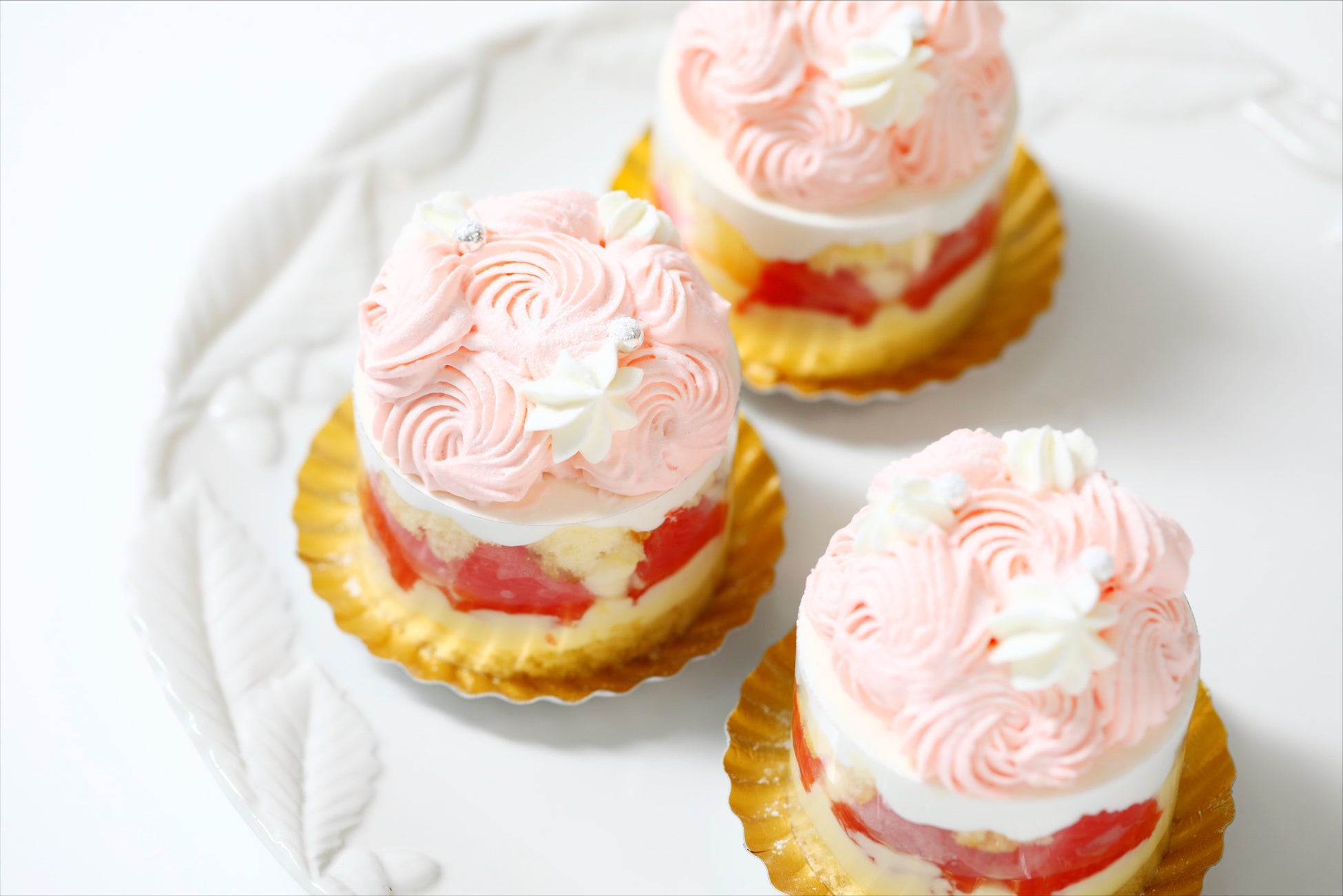 - カスタードクリームとホイップクリームを合わせたピネード自慢のディプロマットクリームと優しい甘さの苺ムースに苦みと爽やかさのあるグレープフルーツルビーを合わせました。