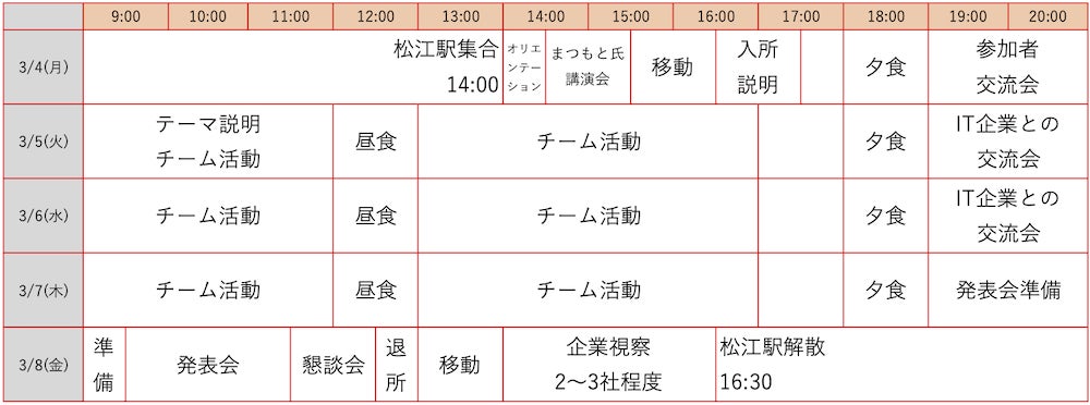 3月8日(金)9:30~の成果発表会を取材対象とします。学生達が各チームごとに作成した作品をご覧いただけますので、取材をご希望の場合は事前にご連絡ください。