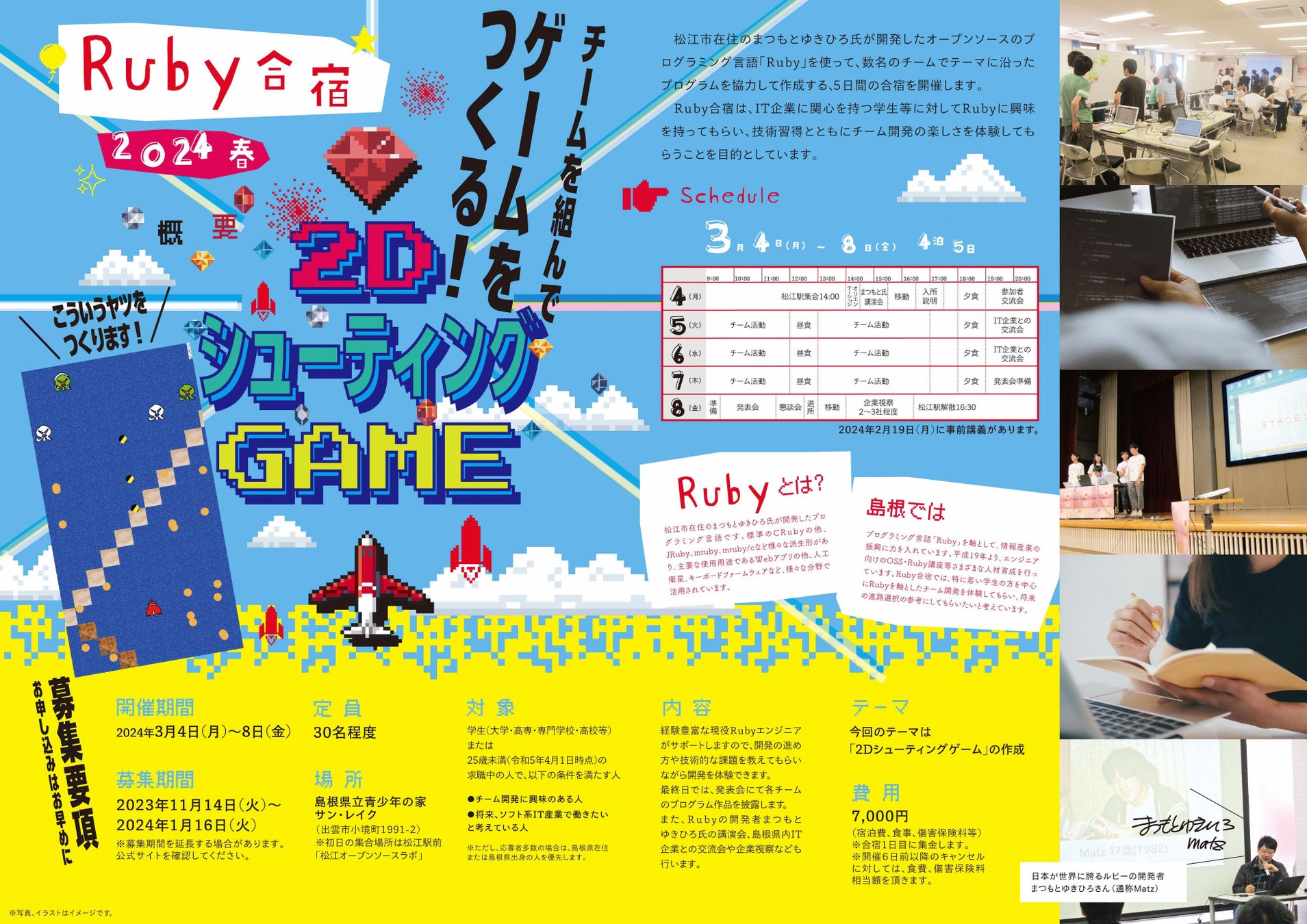 また、Ruby開発者まつもとゆきひろ氏の講演会、島根県内IT企業との交流会や県内IT企業視察を行います。
