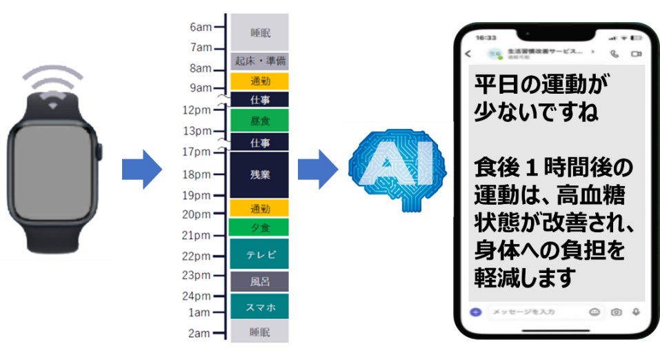 エグゼヴィータ株式会社は、日々の行動データを、ウェアラブルデバイスから自動で取得し、AIで解析するアプリの開発に取り組んでいます。 このアプリと、株式会社グリーンハウスが実施している管理栄養士による栄養指導事業のノウハウを組み合わせ、アプリ利用者の日々の行動を自動で記録した上で、AIが食事や睡眠時間などの生活習慣を分析し、さらに食生活改善などのアドバイスまで行うサービスを開発しました。 本サービスにより、健康経営に取り組む企業の増加と従業員の未病改善が期待されます。 |