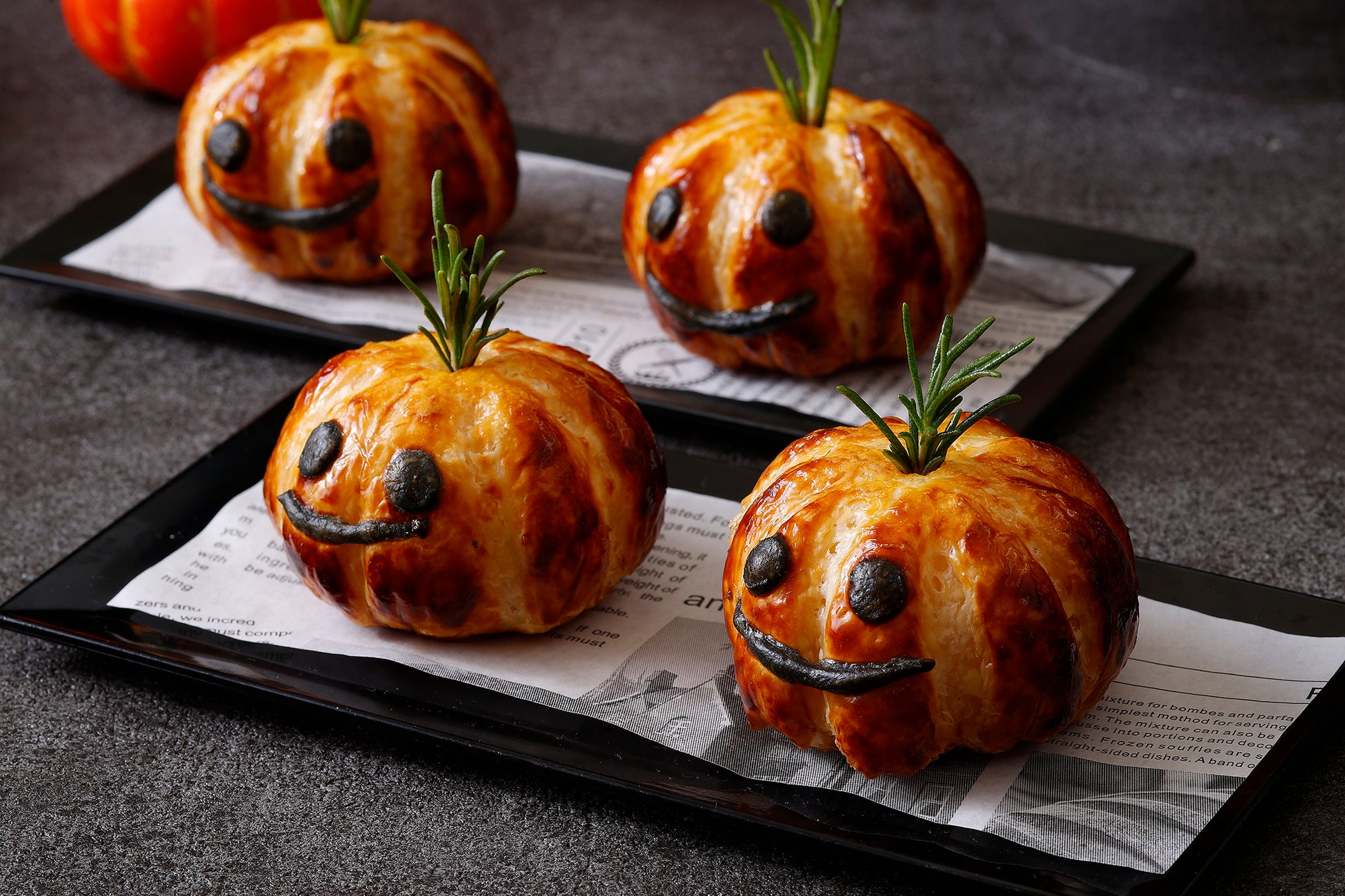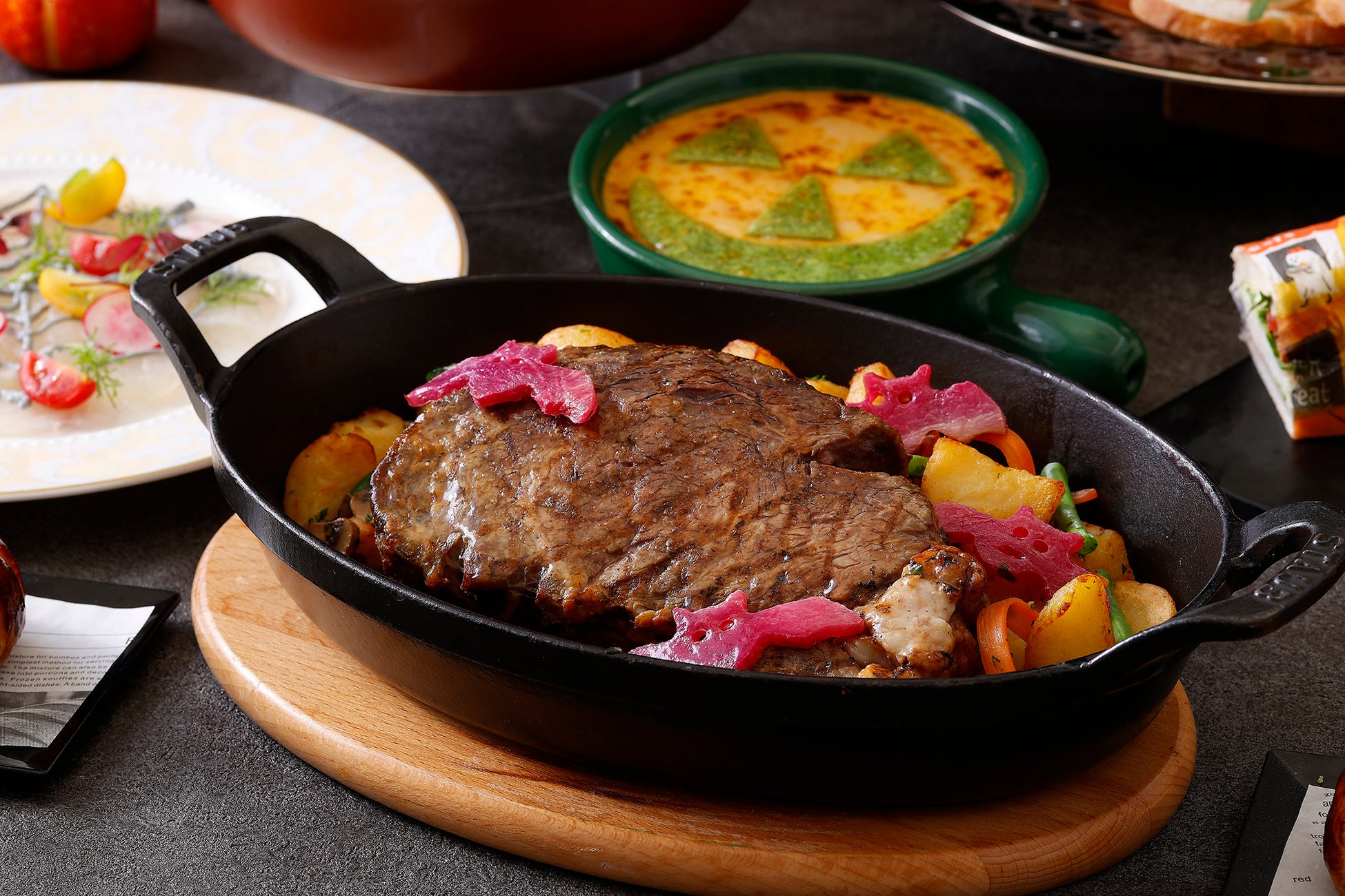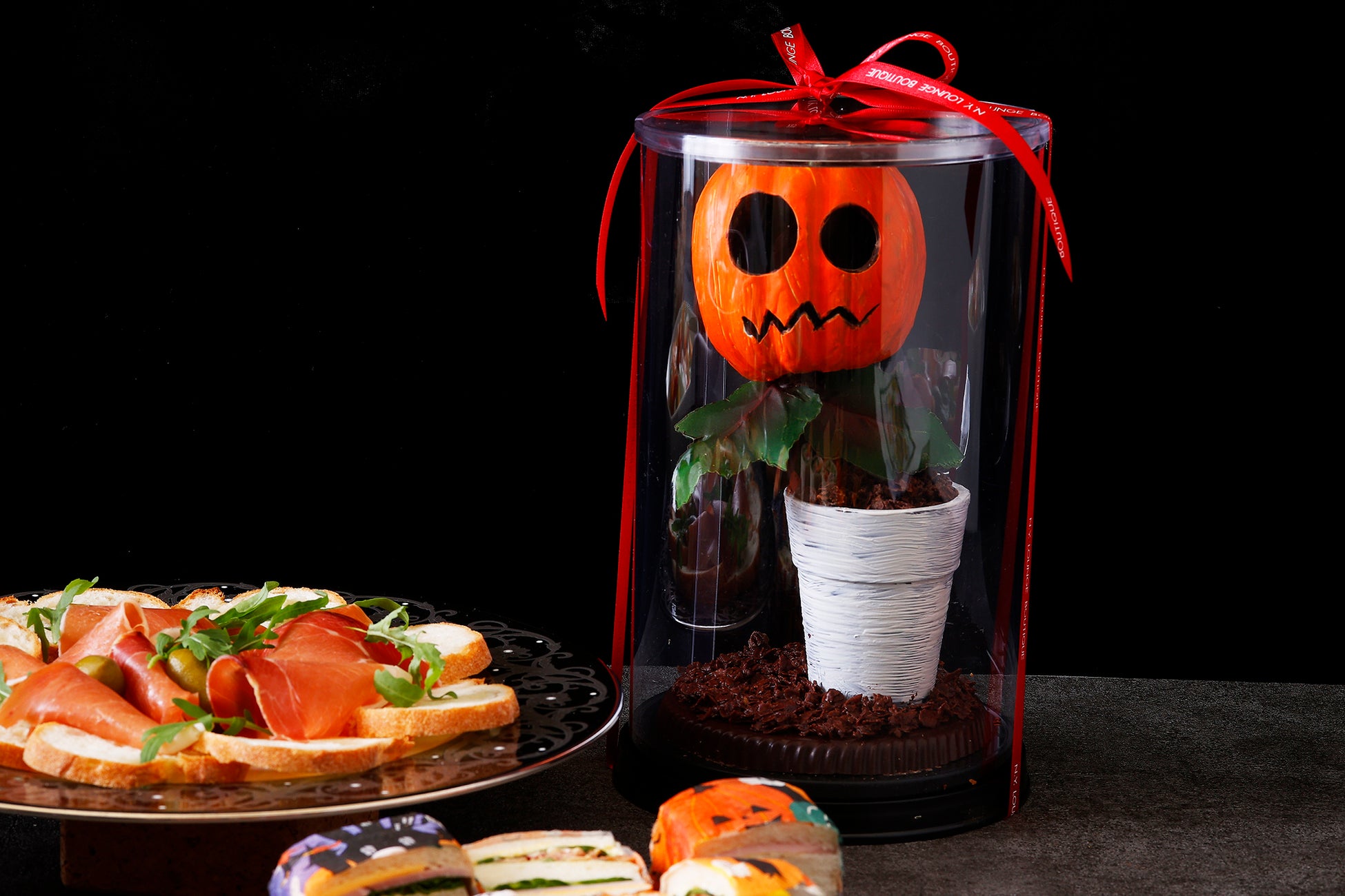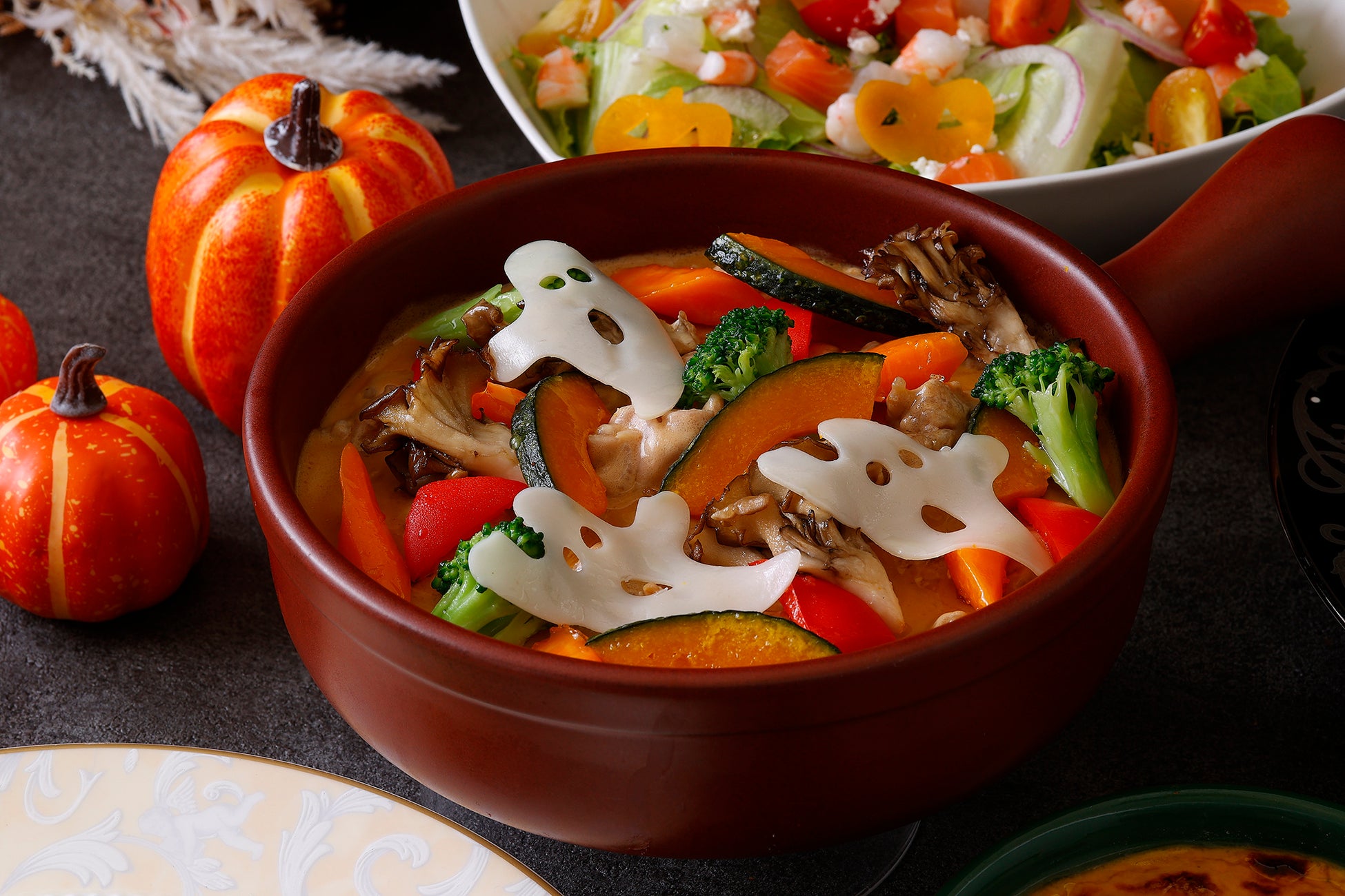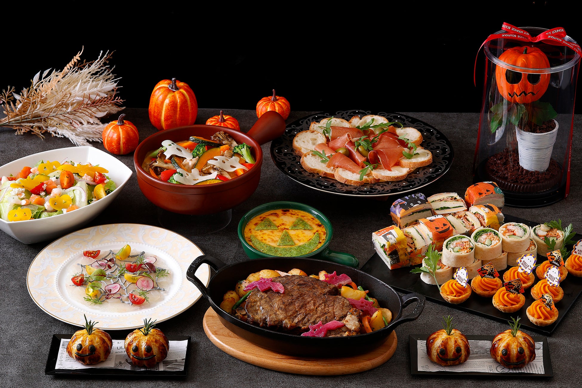 冷前菜はジャック・オ・ランタンやこうもりをモチーフにしたかぼちゃを散りばめたシーザーサラダをはじめ、クモの巣を象ったカルパッチョ、秋の味覚かぼちゃをアレンジしたタルト、シャンパンやビールに合う生ハムやトルティーヤなどをご用意いたしました。温製料理は魚介の旨味が詰まったジャック・オ・ランタンの形をしたパイ包み、ゴーストモチーフの野菜がトッピングされた信玄鶏のソテー、お子様にも人気のシーフードドリアや紫のコウモリを添えたサーロインステーキでパーティーを盛り上げます。デザートには、かぼちゃや鉢植え部分など全て召し上がっていただけるかぼちゃおばけのチョコレートをラインナップ。かぼちゃと鉢植えを割るとアーモンドチョコレートやザクザク食感のフィアンティーヌがこぼれ出します。パーティーの間は飾っておいて、締めのティータイムのお供としてお楽しみいただくのがおすすめです。