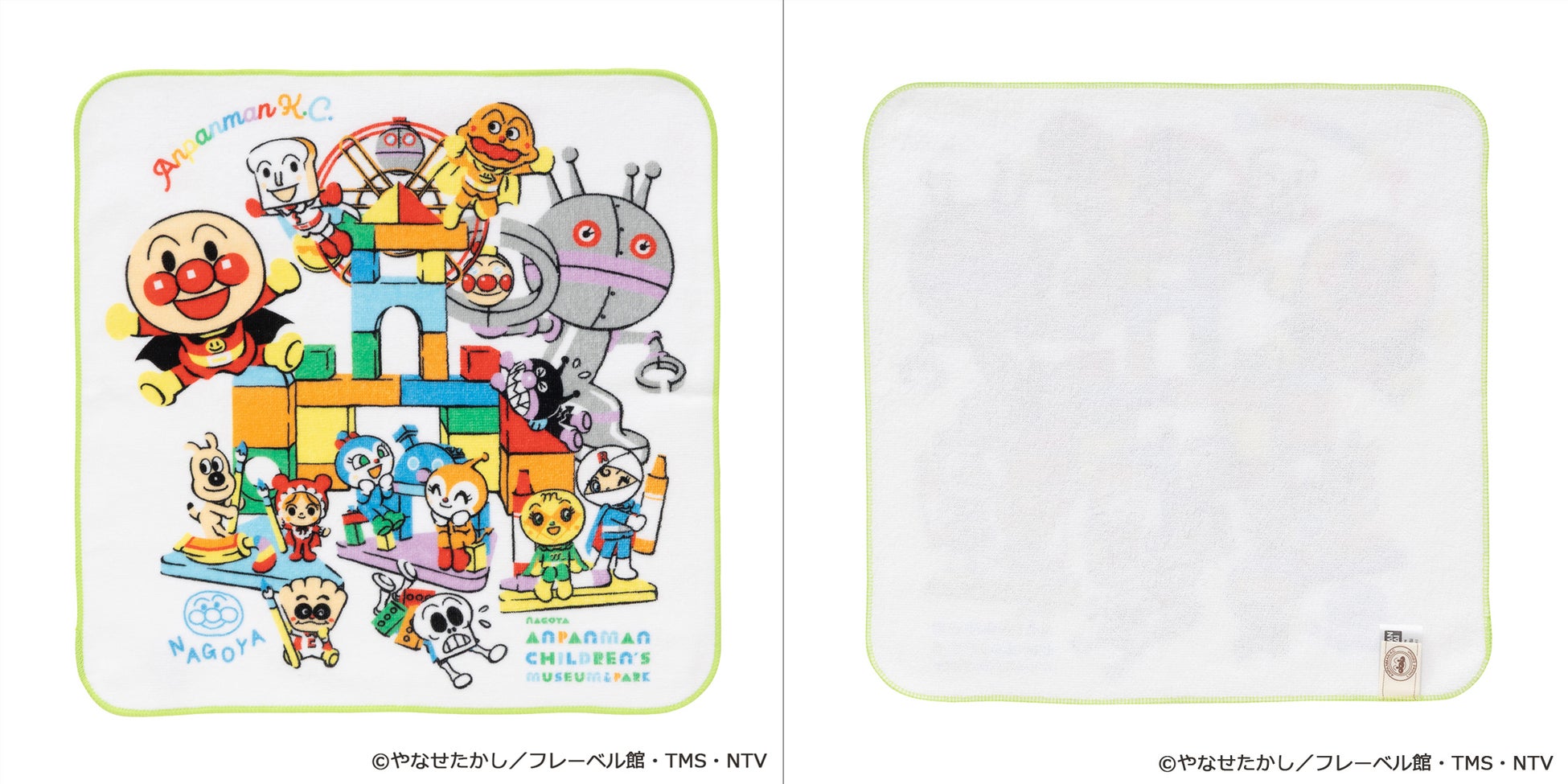 名古屋アンパンマンこどもミュージアム&パークのシンボル「積み木の観覧車」がデザインされています。観覧車の周りにはアンパンマンの仲間たちがいっぱい!(約)33㎝×33㎝の大きめサイズで、ちょっとした水遊びにも活躍します。