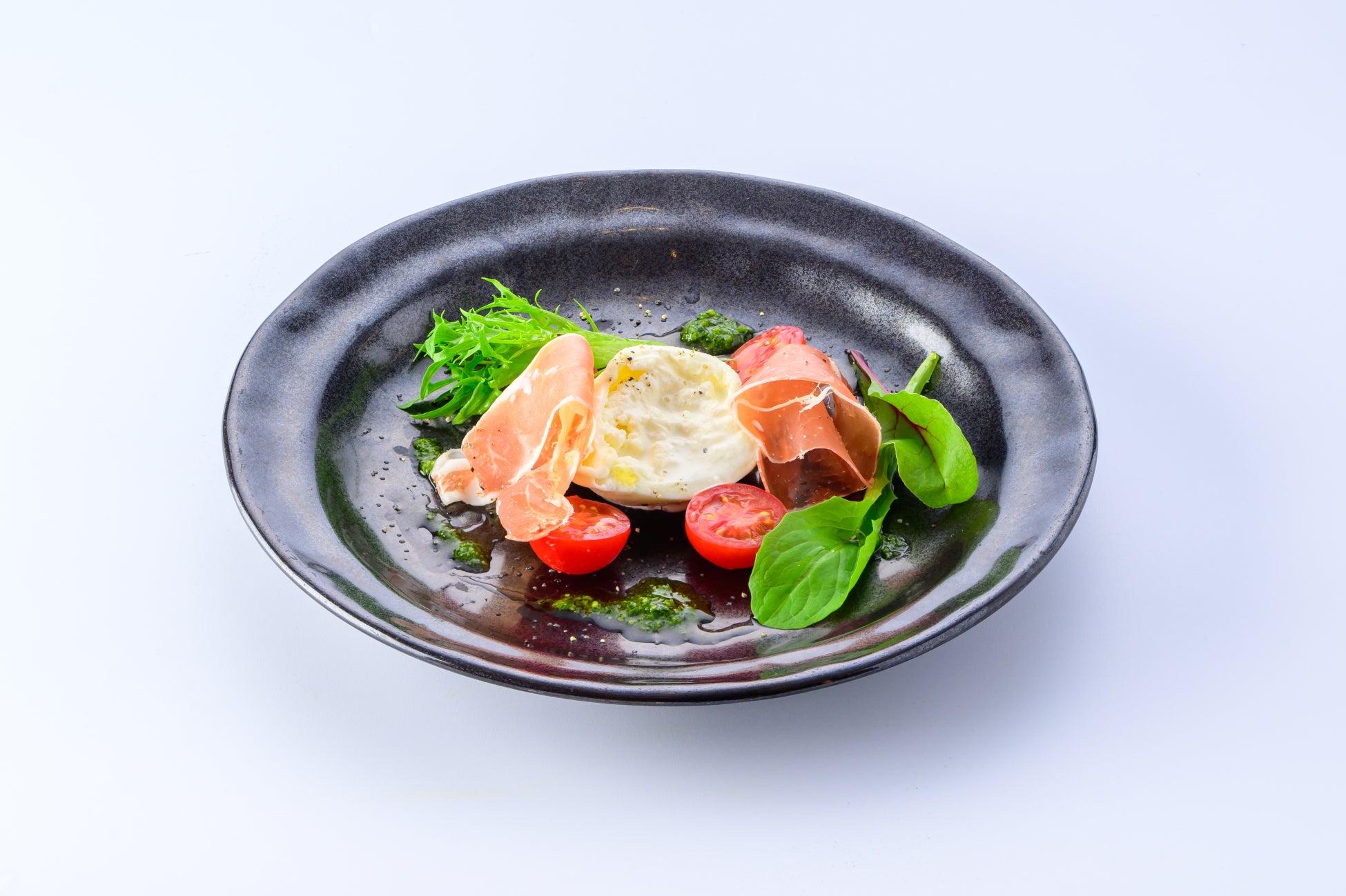 濃厚ブラータチーズと生ハムをジェノベーゼソースで仕上げた大人の前菜プレートです。