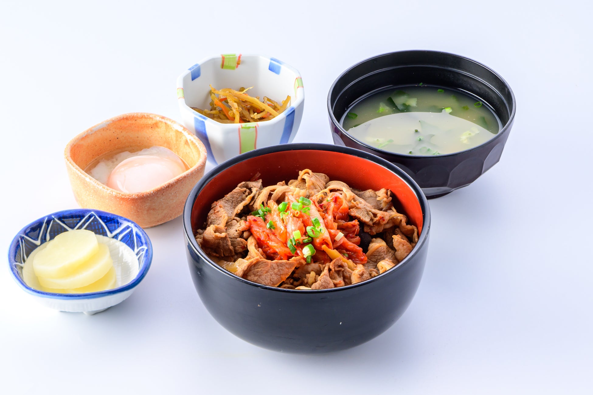 特製牛丼にキムチと温玉を添えたクセになる味わいをご賞味ください。