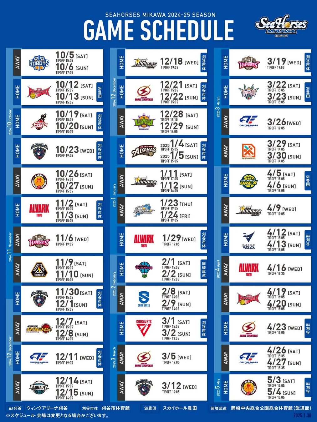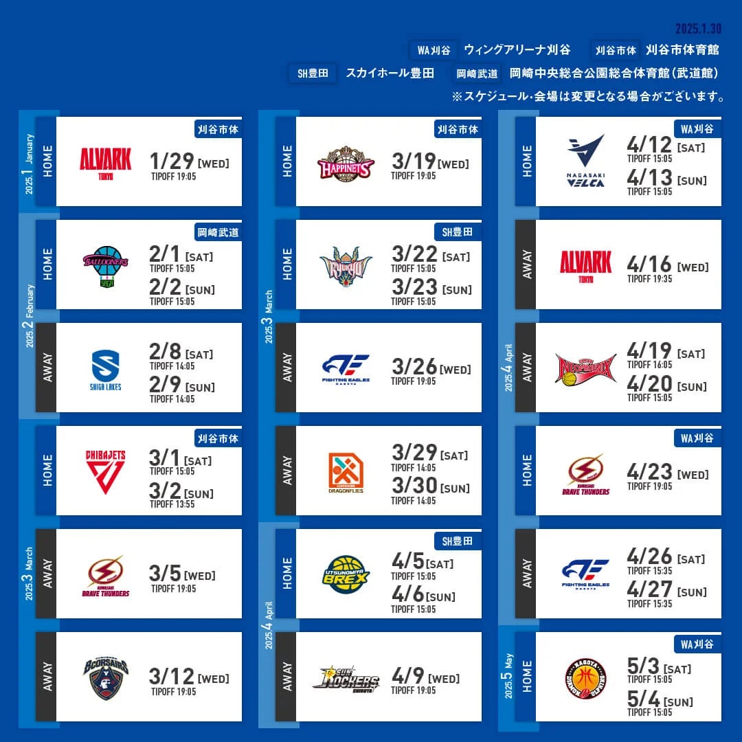 B.LEAGUEより、りそなグループ B.LEAGUE 2024-25 SEASON 32~36節までの試合開始時間および試合会場が発表されましたので、お知らせいたします。
