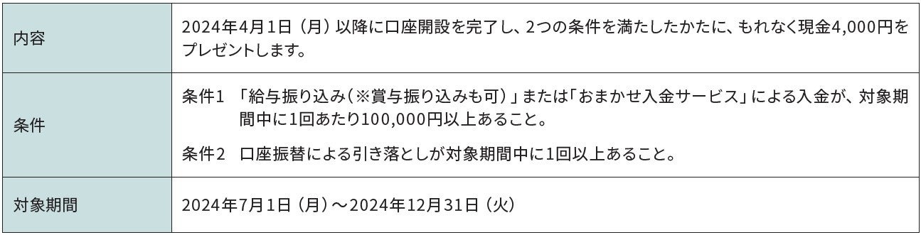 新規口座開設者さま限定 「給与振り込みまたはおまかせ入金」と、「口座振替」でもれなく4,000円プレゼントキャンペーン実施のお知らせ