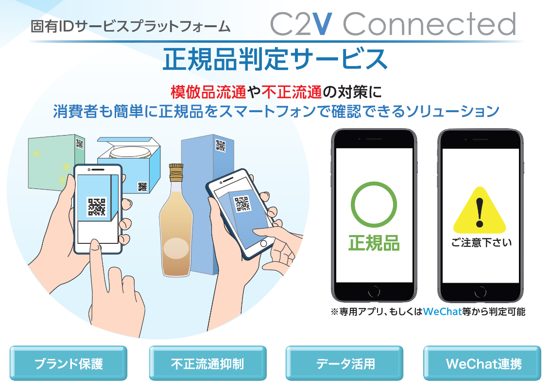 「C2V Connected」は、スマートフォンを利用して誰もが簡単に正規品判定を行うことができるクラウドサービスです。正規品判定用アプリに加えて、中国で利用されているSNS「WeChat※1」の公式アカウントから正規品判定が可能です。また、商品の製造情報およびメーカー出荷から販売までの流通トレーサビリティ情報が商品ごとに付与されたC2V ConnectedのID(QRコード※2を印字したものなど)と紐づけてクラウドへ登録します。不正流通が発覚した際に、メーカー側の調査員は商品に付けたQRコード等をスキャンするだけで、商品の製造情報や入出庫情報といったトレース情報を確認できます。このトレース情報により、非正規品の発見や不正流通の抑制に活用することができます。