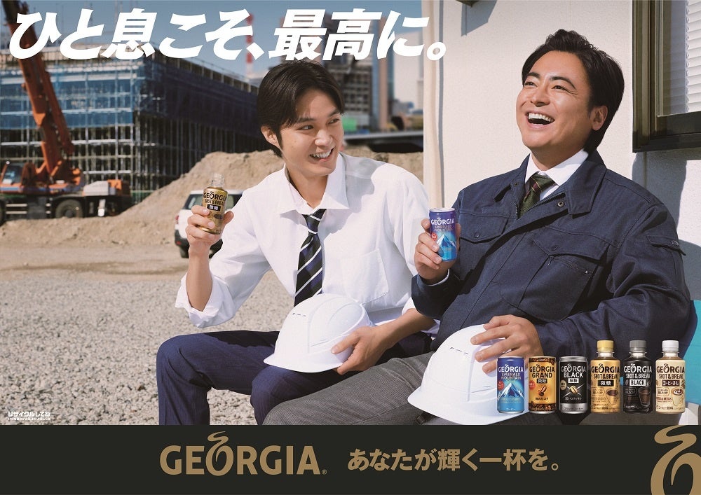 新CMでは、俳優の山田孝之さんと、「ジョージア」のCM初出演となる俳優の磯村勇斗さんを起用しています。会社員役を演じる2人が、「ジョージア エメラルドマウンテンブレンド」と「ジョージア ショット&ブレイク 微糖」を飲みながら仕事中の最高のひと息を表現する内容になっています。