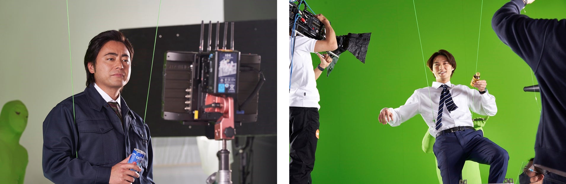 一方、「ジョージア」CM初出演となった磯村さんは、Yシャツにネクタイの営業担当姿で現場入り。早速、休憩所のベンチに着地するワイヤーアクションからスタートしました。ワイヤーを装着した撮影にどこか緊張した様子でありながら、演技のチェックのため真剣にモニターを見つめ、細かな演技指導に応える磯村さん。身に着けているネクタイや、手に持っている鞄も一緒に宙に浮く様子を表現するために、小道具が動くタイミングと合わせた緻密な撮影が行われました。終始周囲のスタッフとも笑顔でコミュニケーションを取りながら、爽やかに撮影を進める姿が印象的でした。