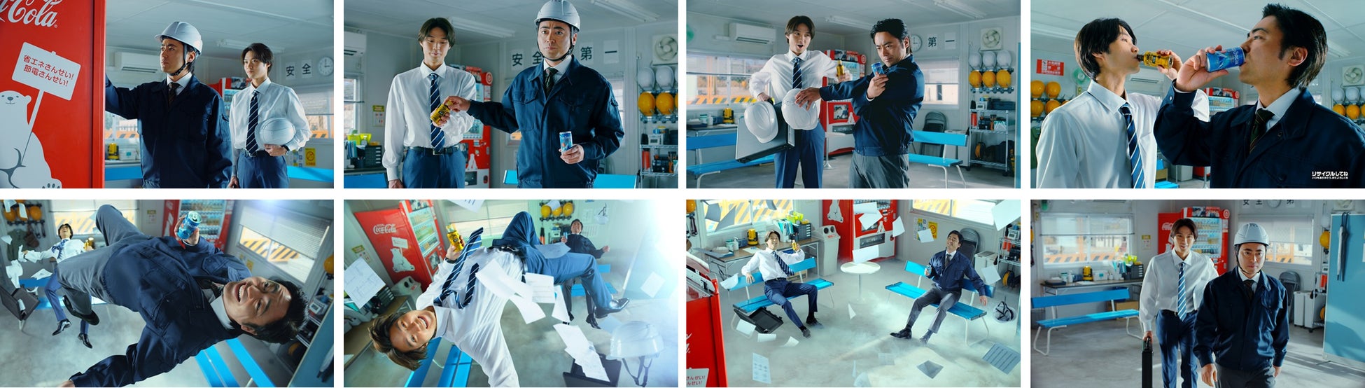 山田さんは「ジョージア エメラルドマウンテンブレンド」を片手に、キリッとした表情で「ジョージア ショット&ブレイク 微糖」を後ろにいる磯村さんに手渡し、「よし、始めるぞ」と一言。磯村さんは「はい!」と元気よく返事をします。山田さんは被っていたヘルメットを脱ぎ、「今日は何分だ?」と尋ねると、磯村さんは腕時計を見ながら、「10分ってとこですね」とキリッとした表情で返答。すると2人は「ジョージア」を片手に腕を伸ばしたり肩を回したり、真剣な表情でストレッチをはじめ、あたかも何か大事なことが始まりそうな雰囲気。「OK!全力でいくぞ!」と気合の入った声で山田さんが言うと、「はい!」と磯村さんも勢いよく返事。製品の蓋を開ける画面に切り替わり、2人は凛々しく、向かい合ってゴクゴクと飲み始めます。