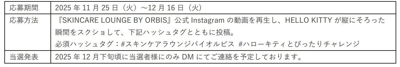 参加条件:SKINCARE LOUNGE BY ORBIS 公式 SNS フォローの上、施設の写真とイベントの感想を以下ハッシュタグと共に SNS(Instagram・X)に投稿