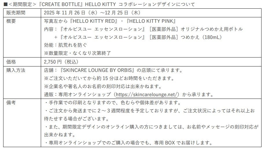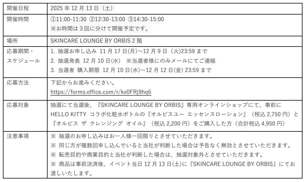 2025 年 12 月 13 日(土)には、クリスマス衣装 の HELLO KITTY の来店イベントを行います。本イベントでは、このイベント参加者のみご購入いただける『オルビスユー エッセンスローション』 のコラボボトルが登場。