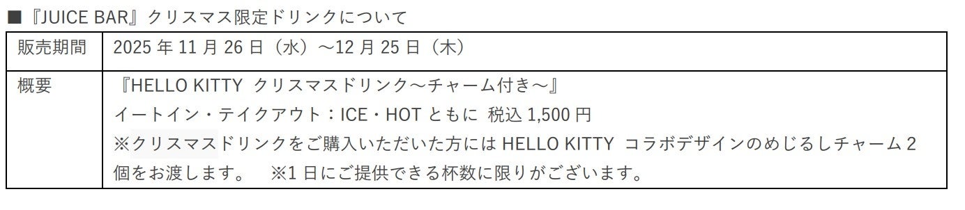 1 階『JUICE BAR』では、クリスマス限定で『HELLO KITTY クリ スマスドリンク~チャーム付き~』を販売いたします。今年のクリスマスドリンクは、ホワイトチョコレートとオーツミルクを合わせた、 りんごのほんのりとした香りとシナモンの風味がアクセントとなり、 冬らしいまろやかな甘さが広がります。トッピングには食感が楽しいサクサクのフレークと、ドライアップル・キャラメルソースを合わせ、柔らかな甘さの中にドライアップルの爽やかさを感じるドリンクになっています。