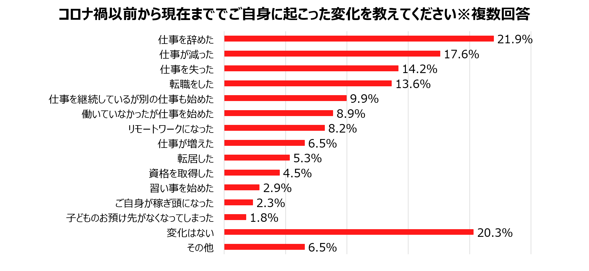 - コロナ禍で自分自身に起こった変化:1位「仕事を辞めた」21.9%