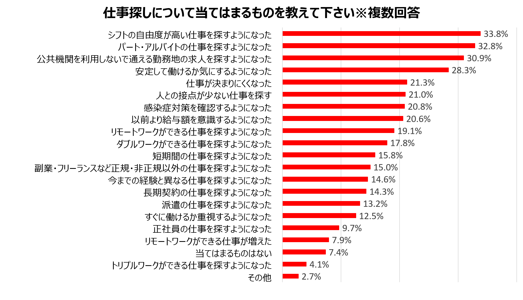 - 仕事探しについて当てはまるもの:約5人に1人が「以前より給与額を意識するようになった」「リモートワークの仕事を探すようになった」
