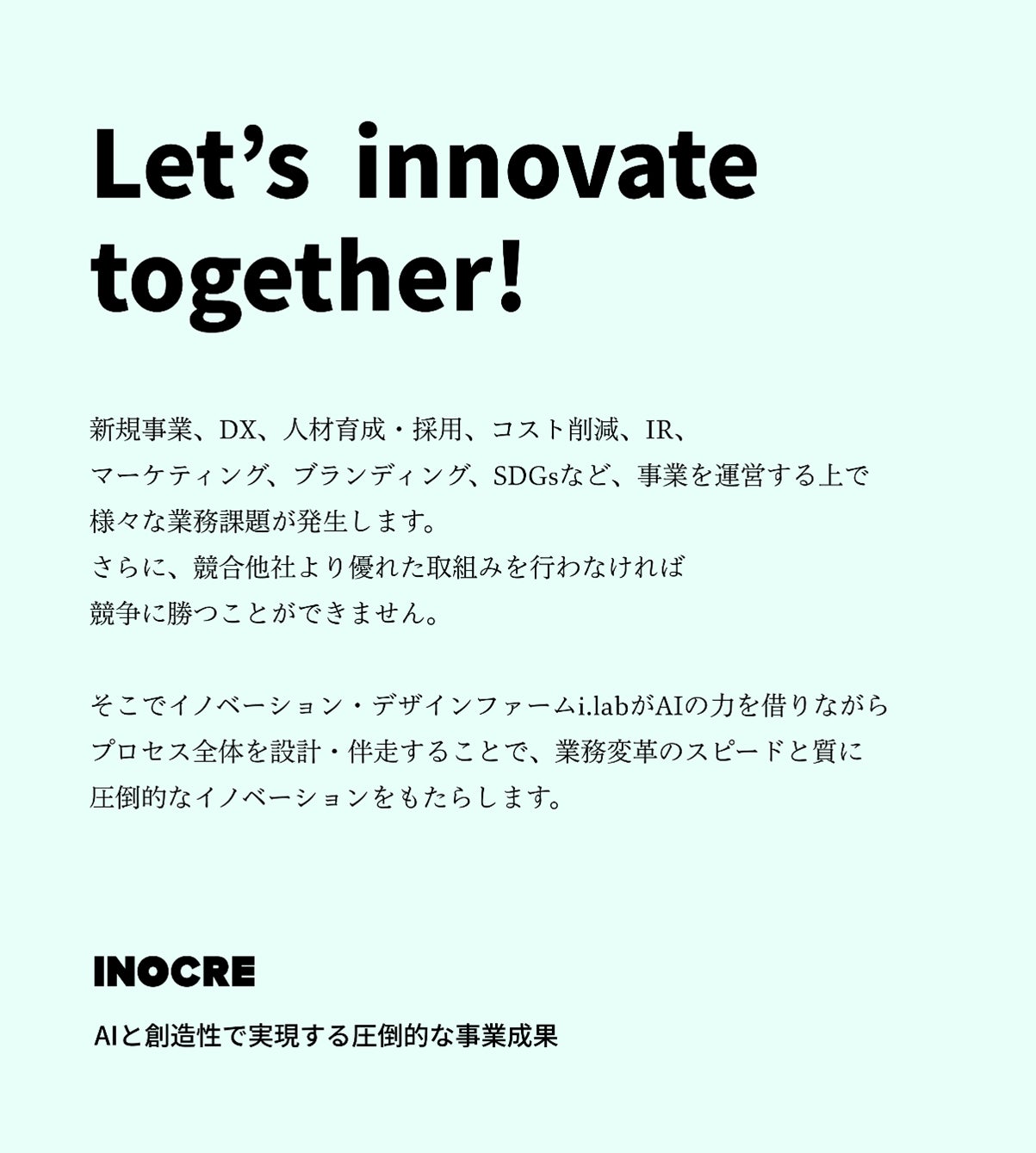 ● INOCREは、新規事業やマーケティング、人材育成・採用などの様々な事業課題をスピーディーかつパワフルに解決するためのサービスです。①生成AIを活用したスピーディーな事業課題把握とMECEな施策整理、②クリエイティブワークショップによるイノベーティブ施策の導出、③分野専門家伴走による施策支援の3ステップでクライアントのビジネス成長に寄与します。