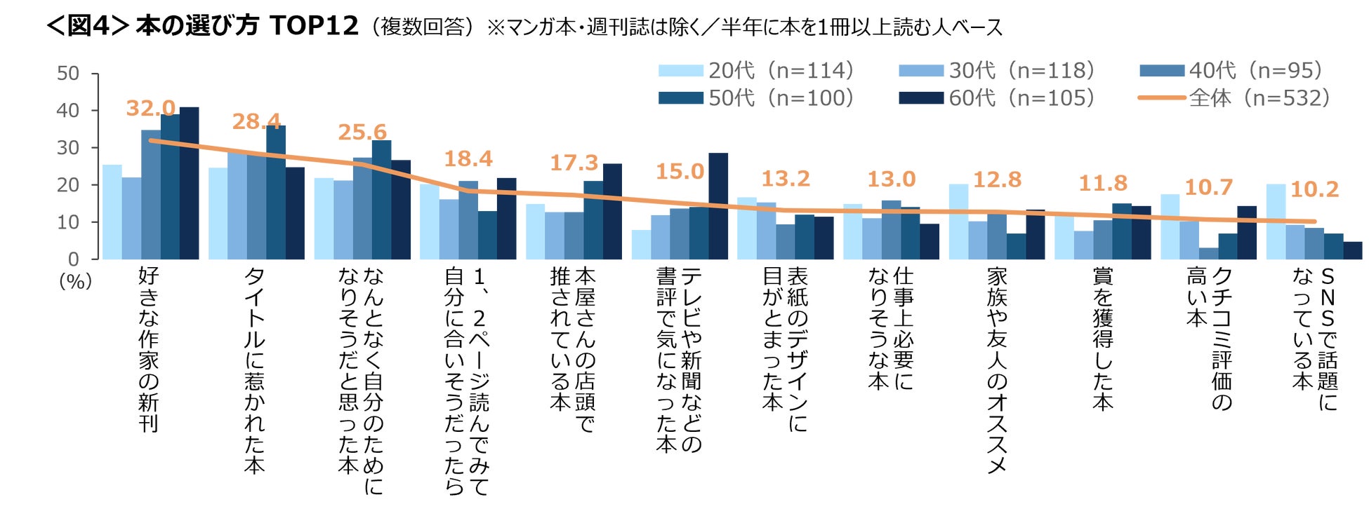 20代は「SNSで話題」、50~60代は「好きな作家」、60代は「テレビや新聞などの書評で気になった本」をきっかけに本を選択している。<図4>