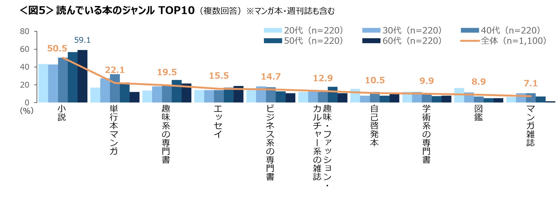 60代は「小説」が6割と特に高い。40代は「単行本マンガ」が他年代と比べ読まれている。<図5>