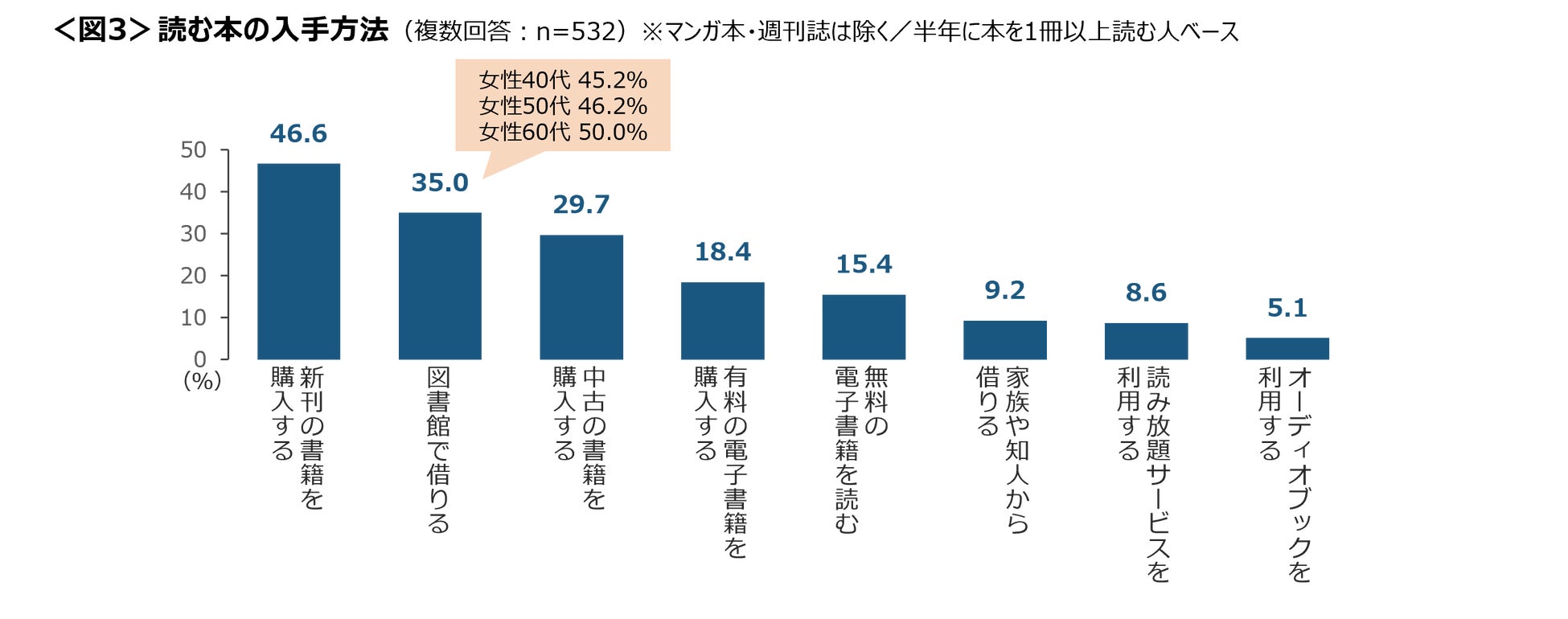 「有料の電子書籍を購入する」「無料の電子書籍を読む」はいずれも1割台。女性40~60代は「図書館で借りる」が4~5割で、特に女性50~60代では最も多い入手方法。<図3>