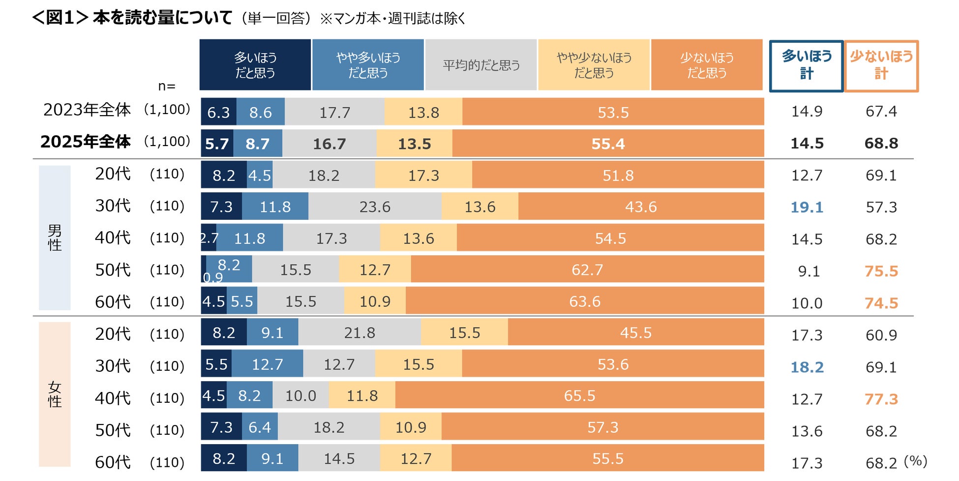 読む量が「多いほう」と思っている人は男女とも30代が高いものの、いずれも2割未満。一方、男性50~60代と女性40代は「少ないほう」の割合が7割半ば。<図1>